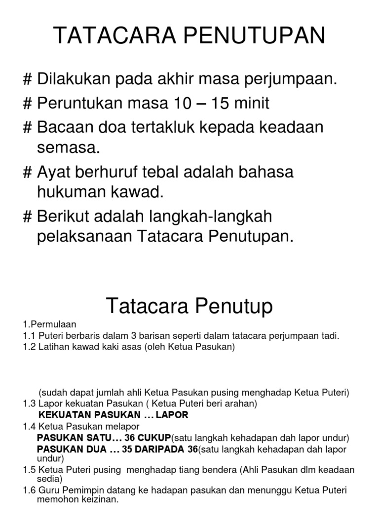 Tatacara Perjumpaaan Dan Penutupan Aktiviti memulakan perjumpaan Menghimpunkan ahli Menyampaikan maklumat Menerima tugasan dan Menutup perjumpaan. 0 Tatacara Perjumpaan TATACARA PERJUMPAAN LANGKAH 1 11 Ketua Pasukan Ketua Kumpulan melakukan latihan Kawad Kaki Asas. Tatacara perjumpaan Add to my.